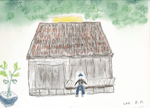 「旅する女シャーリーバレンタイン」というビデオを今日みました。10年前も映画で、また草笛光子さんの一人芝居でも観ています。シャーリーは壁にむかって、話をします。「私は今のままでいいの?」 旅をして、自分を見つけたと言ったシャーリーは今どうしているのだろう。今日は以前のような強い共感はありませんが、シャーリーは大好きな個性です。 この絵は映画の一シーン(のつもりでした)。シャーリーはギリシャの海辺で暮れゆく太陽を眺めながら、椅子にすわってワインを飲みます。シャーリーのようにテーブルに椅子の私を描こうとしたら、失敗して、結局ジーンズを着せて、海は近くの湘南の海のようになりました。 それもいいか。私も海の匂いと風を感じたような気がしました。