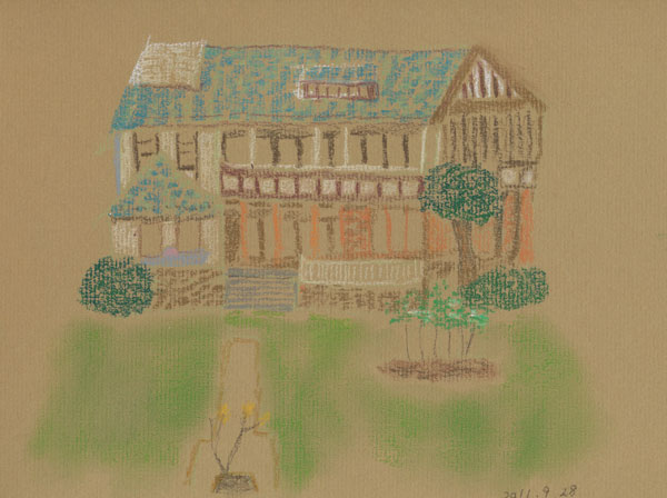 今日はお休みで、この前の清風レディーズ旅で行った鎌倉の洋館を描いています。 色画用紙にパステルです。 ガラス窓の色が画用紙の色でした。NHKの「おひさま」で使われた洋館だそう。安曇野の帝王のおうち。まちこさんの部屋は2階。 窓や植木をいれまして 空の色にまよったりで 描いては消し。。。 そして こんなかんじ ティッシュで 空を描いてみました。 おひさま 最終回はすぐ