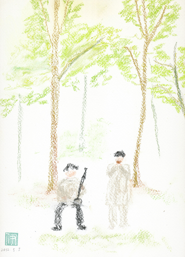 お茶摘みのコンサートの絵です。 覚えているのを感じたまま描きました。緑の葉っぱがひかりをはなっているようだと描いている時に思いました。本当にそんなかんじ。 うすいクリーム色の画用紙(パステル用ワトソン紙)ゴンドラのパステル 紙が大きくてスキャナを2度、下のところをくっつけました。