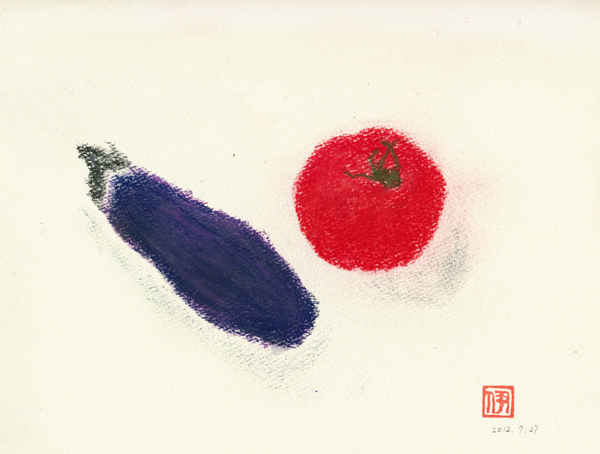 暑くて、外に出るとサウナの中にいるようです。ここは潮の匂いもします。 買いためていたものを夕飯にすることにして、今日はほぼ一日家の中にいました。 トマトとなすびを描きました。どっちも夏野菜で特価品 トマトは福島県産で4つ298円 なすびは群馬県産で5つ98円 どっちもこぶりですけど皮がうすくて旬の野菜です。 今日はぴったりの色が見つからなくて、いろいろな色を塗っていくうちに似てきました。 こっちは似ていない絵です。朝のNHKのニュースの天気予報士の渡辺 蘭さんです。毎朝彼女の予報が楽しみです。ファッションスタイルもちょっと独特。