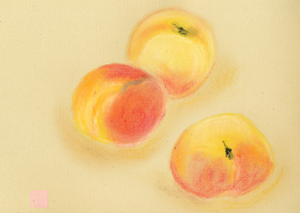 家人Tの実家のお義兄さん家族から送ってくださった桃です。 描いている間もとってもいい匂いでした。 おなかが治ってからいただこう。岡山の桃は色白です。